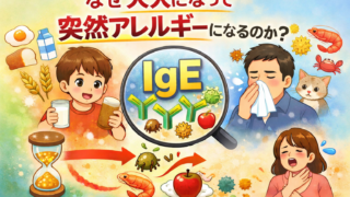 子どもの頃は平気だったのに、大人になって突然アレルギーになることがあります。なぜこのようなことが起こるのでしょうか。本記事では、子どもと大人に多いアレルギーの違い、ダニアレルギー、花粉症、甲殻類アレルギー、アレルギーマーチ、IgE抗体や閾値の仕組みをやさしく解説します。