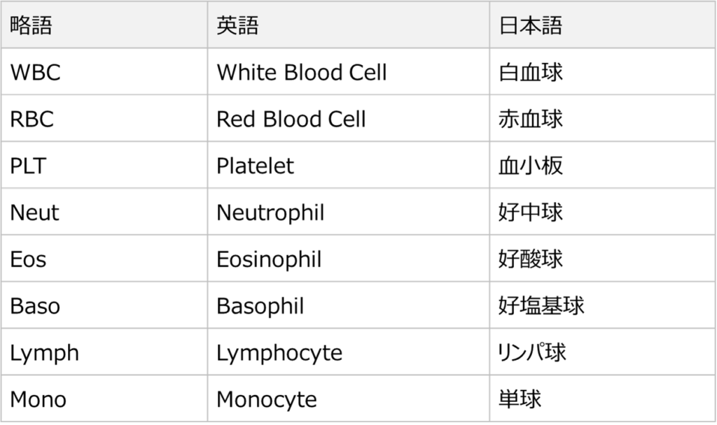 さらに現場では、白血球や赤血球といった日本語ではなく、WBC、RBCといった英語表記で扱われることがほとんどです。