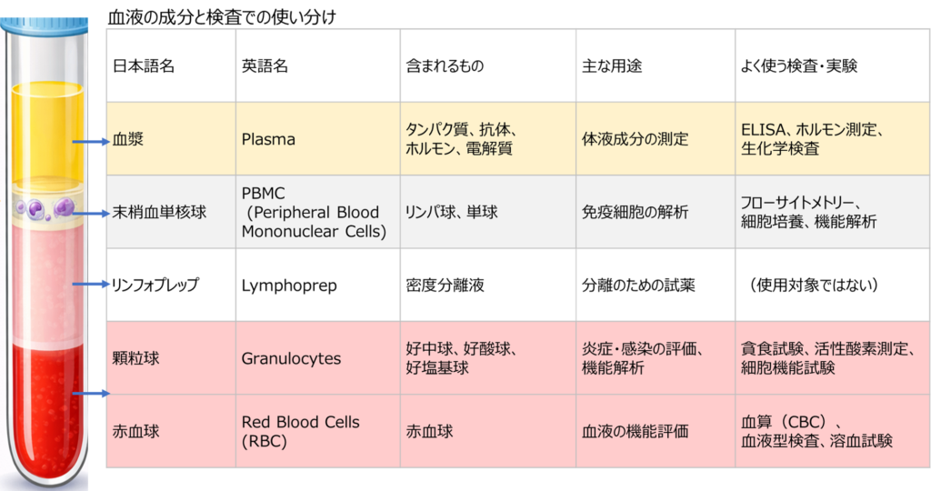 そのため、同じ血液サンプルでも、一部を全血として使用し、その後に遠心分離して別の分画を用いるといった操作が行われることもあります。