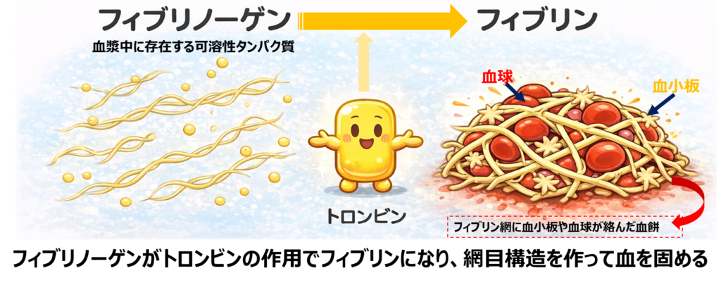 血液中にある「フィブリノーゲン」というタンパク質が、トロンビンという酵素の働きによって変化し、フィブリン(糸が集まってできた網のような構造)になります。