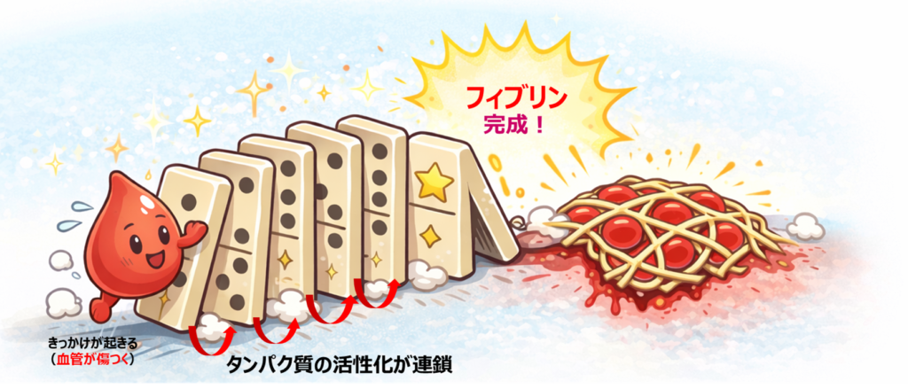 このフィブリンが作られる過程では、凝固因子(タンパク質)が順番に働くという特徴があります。