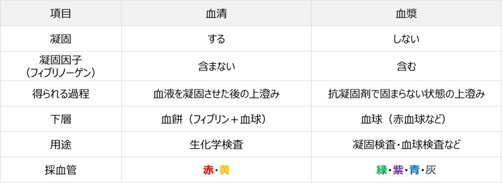 - 固める採血管では血清、固めない採血管では血漿が得られる