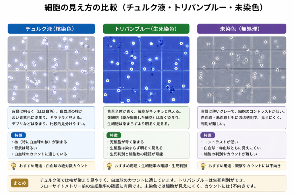 細胞カウントに使う染色液の違い(全体像)