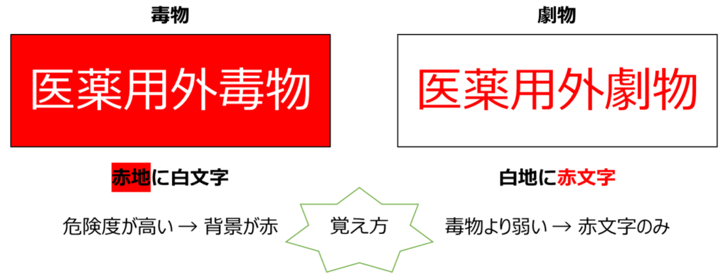 毒物は「赤地に白文字」、劇物は「白地に赤文字」で表示されます。
