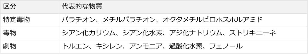 ただし実際には毒性だけで決まるわけではなく、政令で指定されたリストによって決まります。