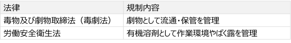 これらはどちらも**毒物及び劇物取締法(毒劇法)**で指定された有害な化学物質ですが、