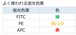 また、蛍光色素ごとに励起波長や放出波長が異なるため、複数の蛍光色素を組み合わせて多色解析を行うことができます。