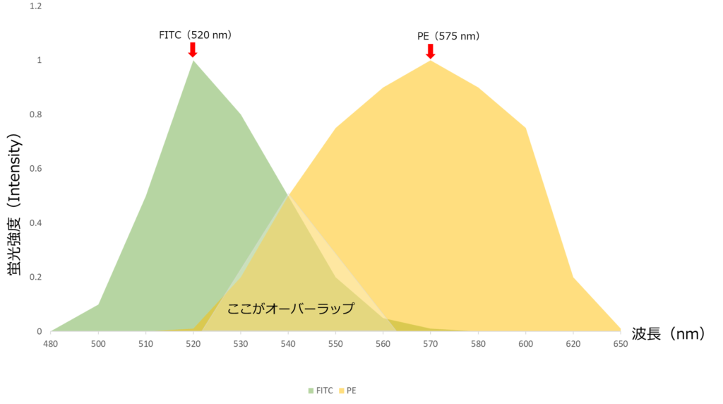 例えば、FITC(緑)とPE(オレンジ)を同時に使うと、
